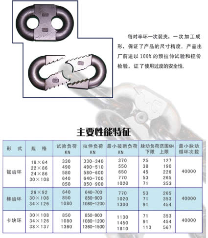礦用圓環鏈用開口式連接環22×86 C 試驗負荷:415kN。試驗負荷下最大伸長率:≤2 ;% ;。最小破斷負荷:≥550kN。破斷后永久伸長率:≥ 8 ;% ;。脈動負荷范圍(kN):下限38 上限190。最小脈動循環次數:40000。