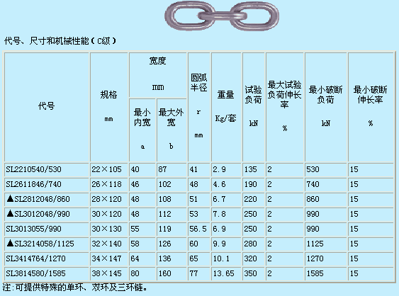礦車三環(huán)鏈 ★應用:礦車連接 ★材料:優(yōu)質(zhì)合金鋼 ★制造標準:ISO、DIN、BS、GB、MT等標準 ★強度等級:C級,B級 ★安全保證:驗證載荷為2倍工作載荷